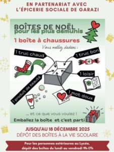 Les élèves et l’équipe pédagogique participent activement à la création de ces boites cadeaux, mais font aussi appel à chacun pour que la collecte soit bonne. Ainsi, les boites peuvent être déposées à la Vie Scolaire du lycée, du lundi au vendredi, entre 9h et 17h.